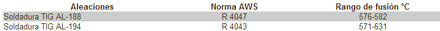 Aleación para soldar a baja temperatura sin que se funda el metal báse, alta resistencia mecánica y a la corrosión. Excelente para refrigeracion, aire acondicionado, electrodoméstico. Soldar mediante proceso TIG. Con proceso oxigas, usar fundente en polvo. Aleaciones con bajo tenor de silicio para soldar variados tipos de aluminio sin que funda el metal base. Para sellados de ductos, armado de piezas estructurables.